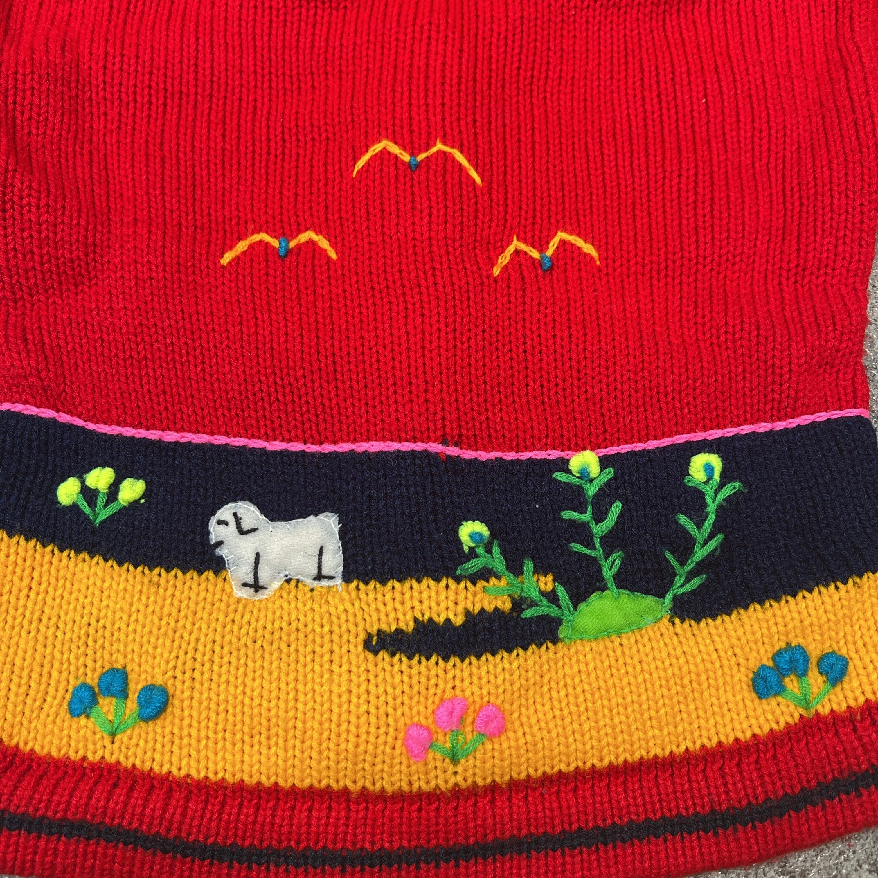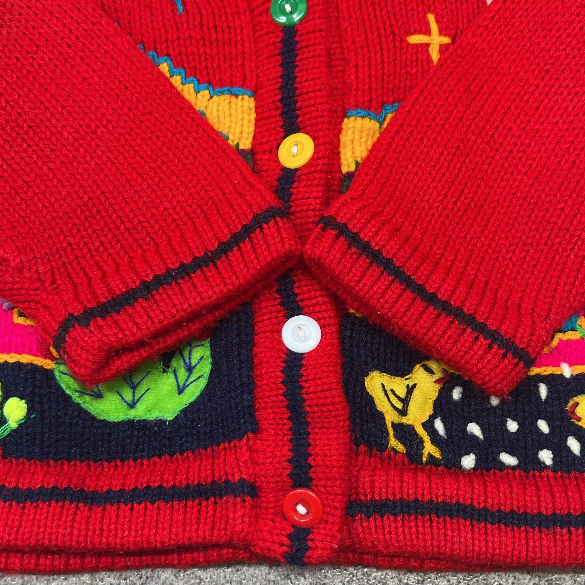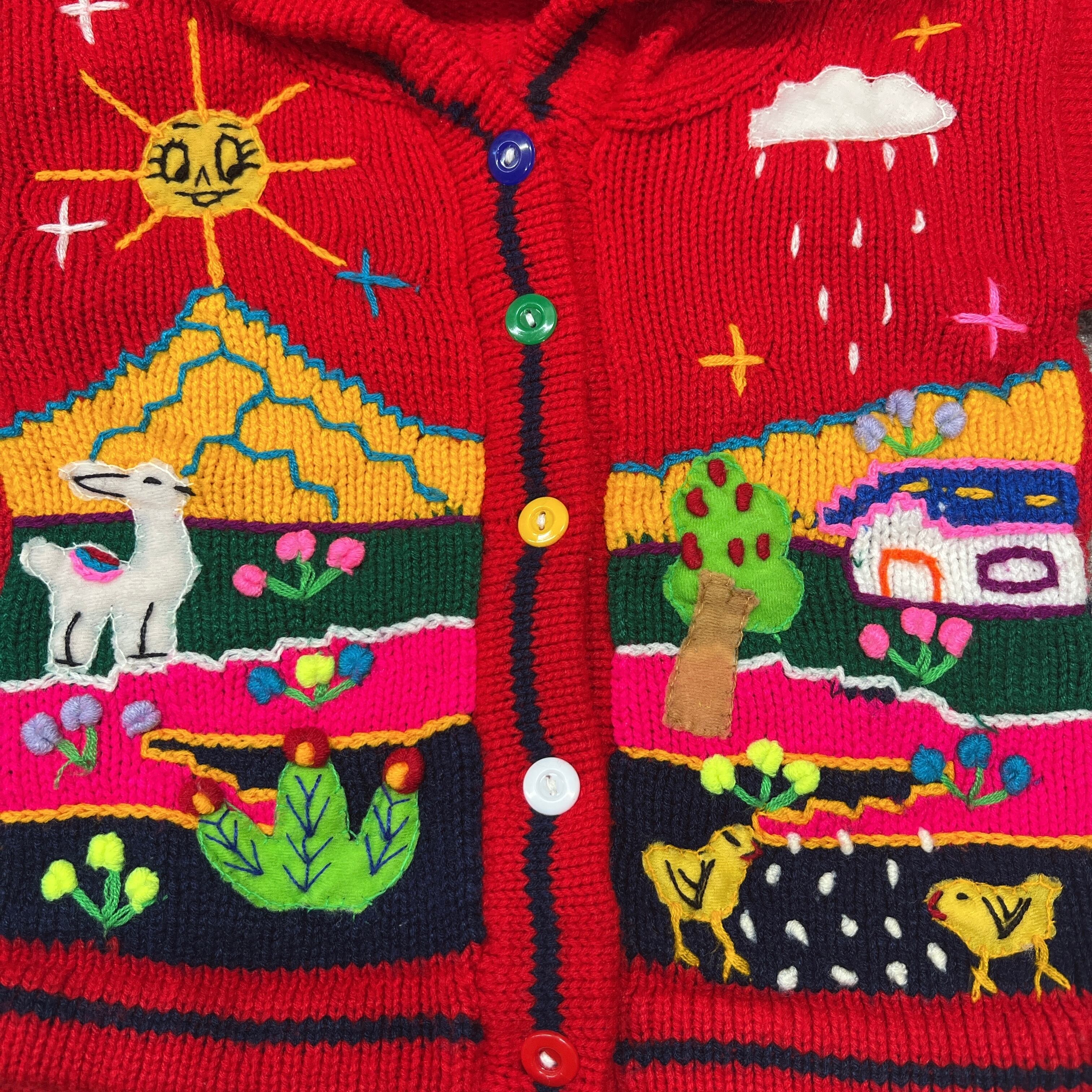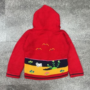 【3-4T】Peru knit/handmade foodie cardigan/red ペルーニット ハンドメイド フード付きカーディガン 赤